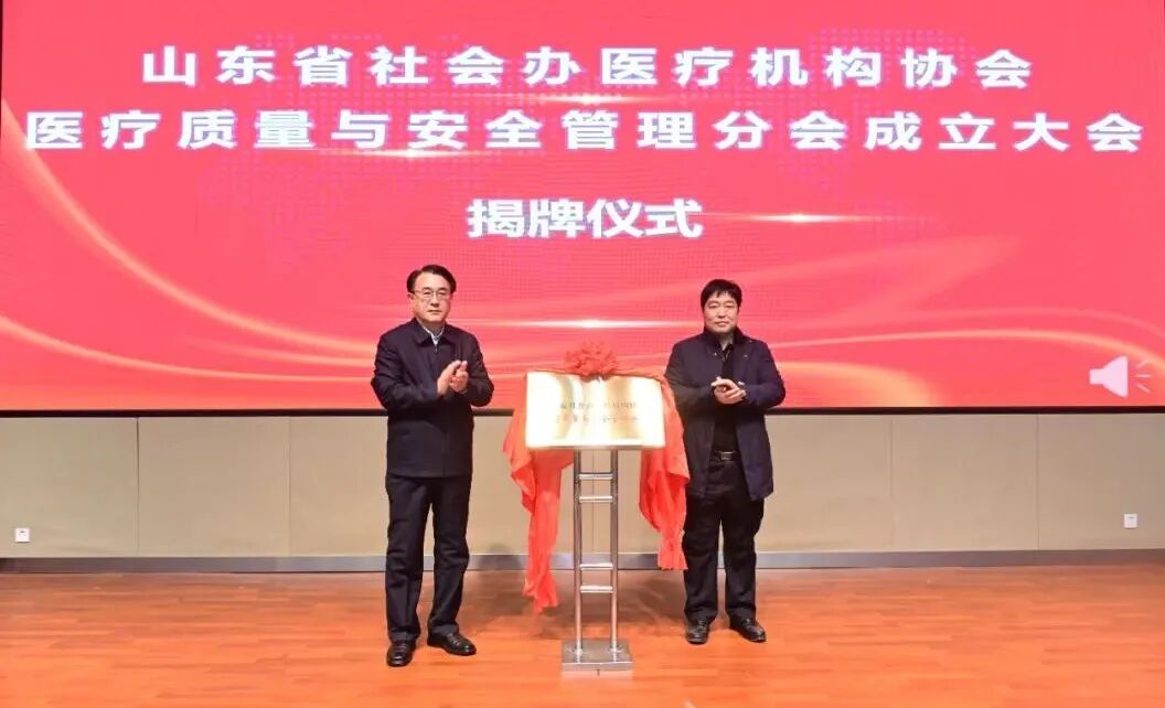邹城市副市长布方锋(右)与协会顾问、医院管理分会会长靳清汉(左)为协会医疗质量与安全管理分会揭牌
